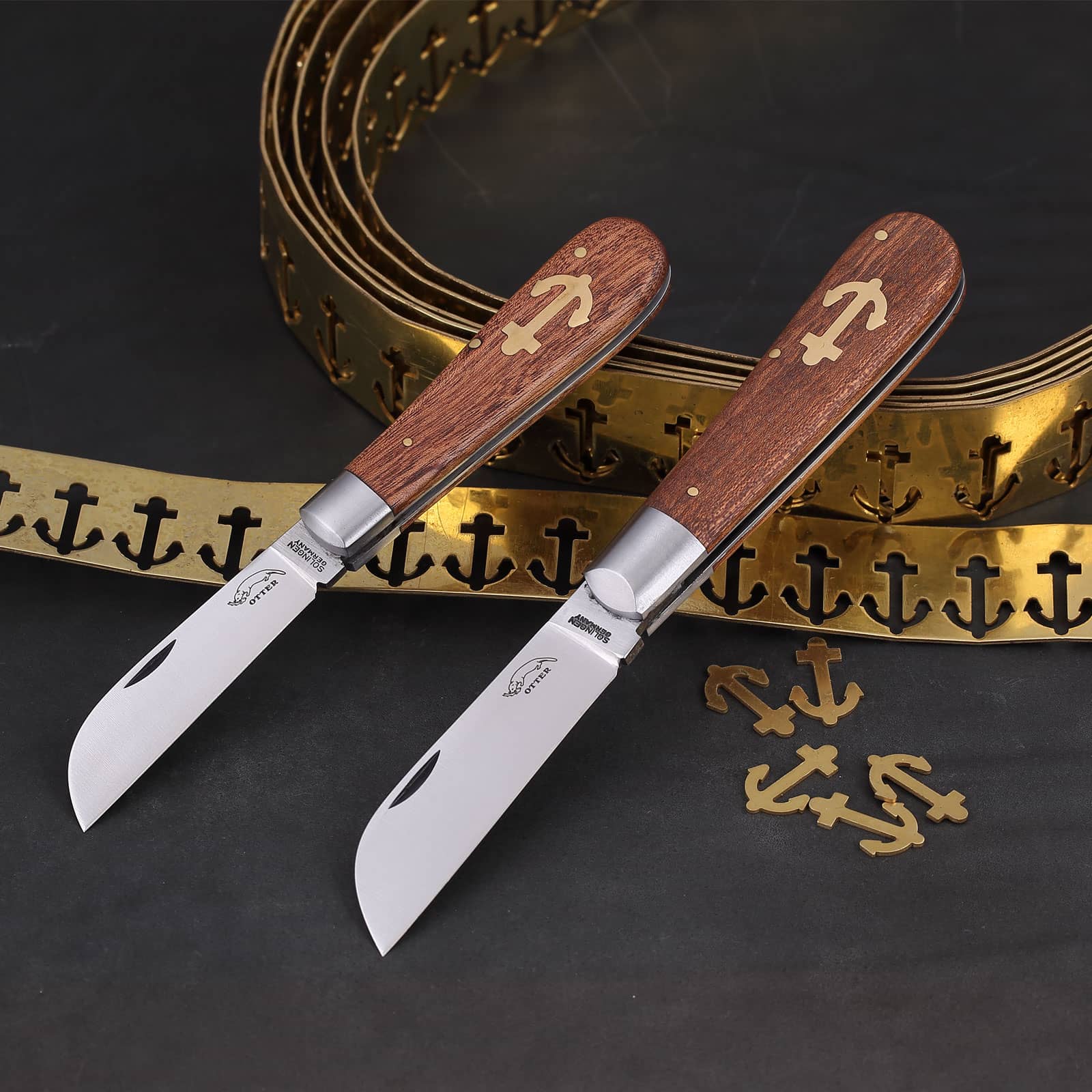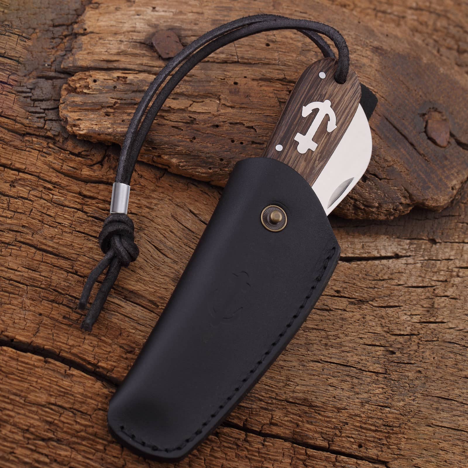 Seit Mitte des 19. Jahrhunderts werden Ankermesser produziert. Form und Klinge waren schon damals mit den heutigen Messern vergleichbar. Wann genau der Anker als Stilelement dazu kam, lässt sich historisch nicht mehr genau nachvollziehen. Die Klinge mit gerader Schneide und heruntergezogener Spitze eignet sich sowohl für ziehende Schnitte als auch zum Entschuppen von Fischen.Die Bohrung und Lederschlaufe ermöglicht ein Sichern des Messers gegen Verlust. Der in den Holzgriff eingelassene Messinganker verleiht dem Taschenmesser ein besonderes Flair. Heute hat sich dieses Modell als Alltagsmesser etabliert. Wir fertigen das Messer in verschiedenen Variationen mit unterschiedlichen Hölzern und Materialien.